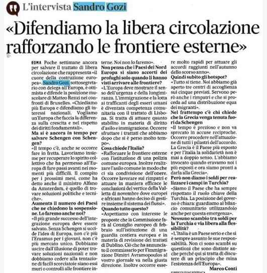 “Il più grande successo dell’integrazione europea va salvato – sottolinea Gozi -. Senza Schengen si uccide l’idea di Europa, non c’è più Erasmus per i giovani, non c’è più Mercato unico. Dobbiamo uscire dall’illusione di trovare soluzioni nazionali e non dobbiamo cedere alla tentazione di facili scorciatoie, siano esse muri o controlli alle frontiere interne. Noi non lo faremo”.