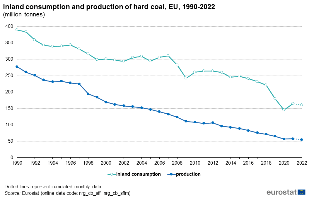Bruxelles – In un’Unione Europea in cui la parola d’ordine è diventata la transizione energetica verso fonti pulite, necessaria per raggiungere l’obiettivo della neutralità climatica entro il 2050, c’è un dato che per il secondo anno consecutivo fa a pugni con il Green Deal: quello relativo alla produzione e consumo di carbone. Secondo l’ultimo rapporto pubblicato da Eurostat, anche nel 2022 sono aumentate rispettivamente del 5 e del 2 per cento, con ben 349 milioni tonnellate di carbone prodotto e 454 milioni di tonnellate di carbone consumato sul territorio Ue.